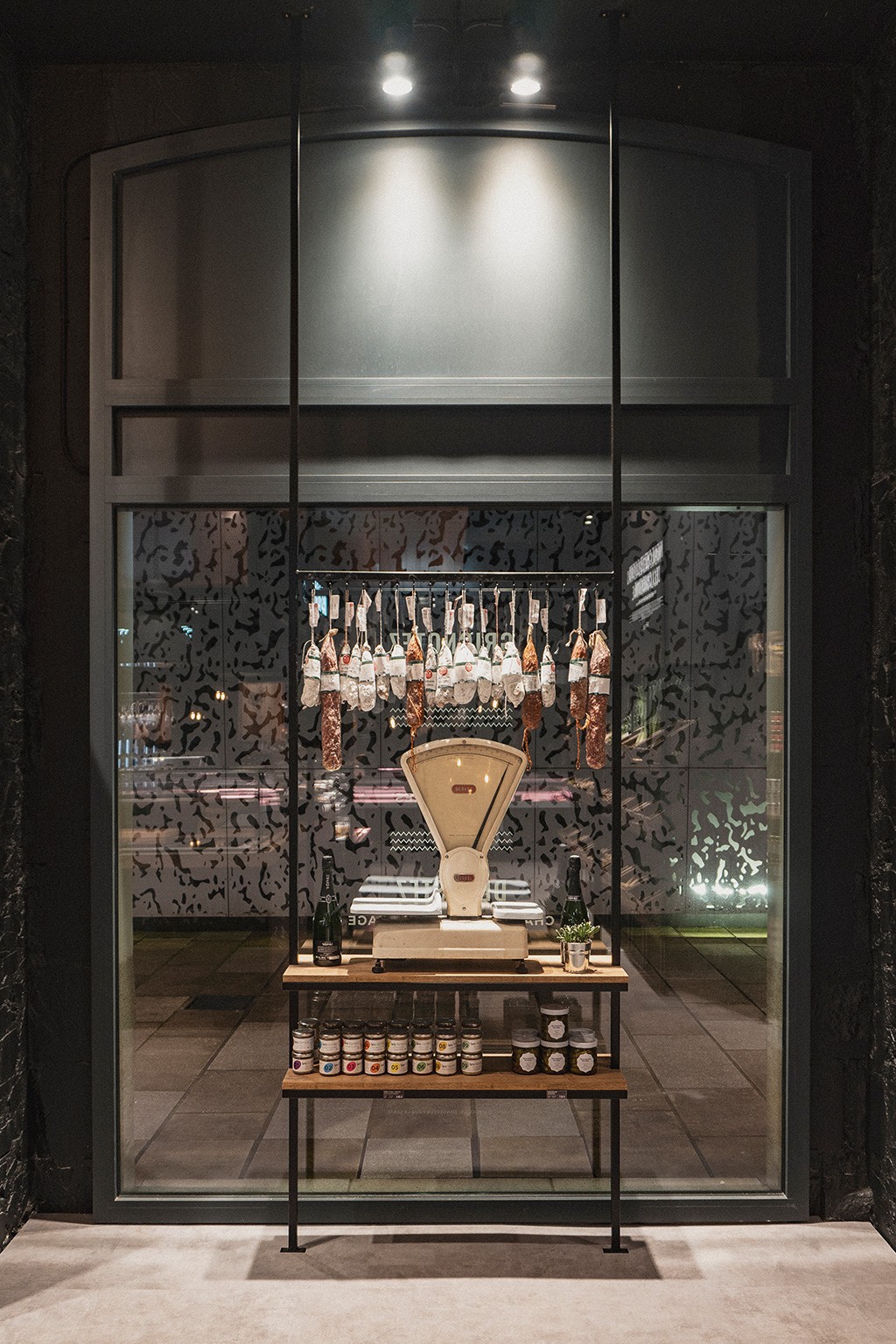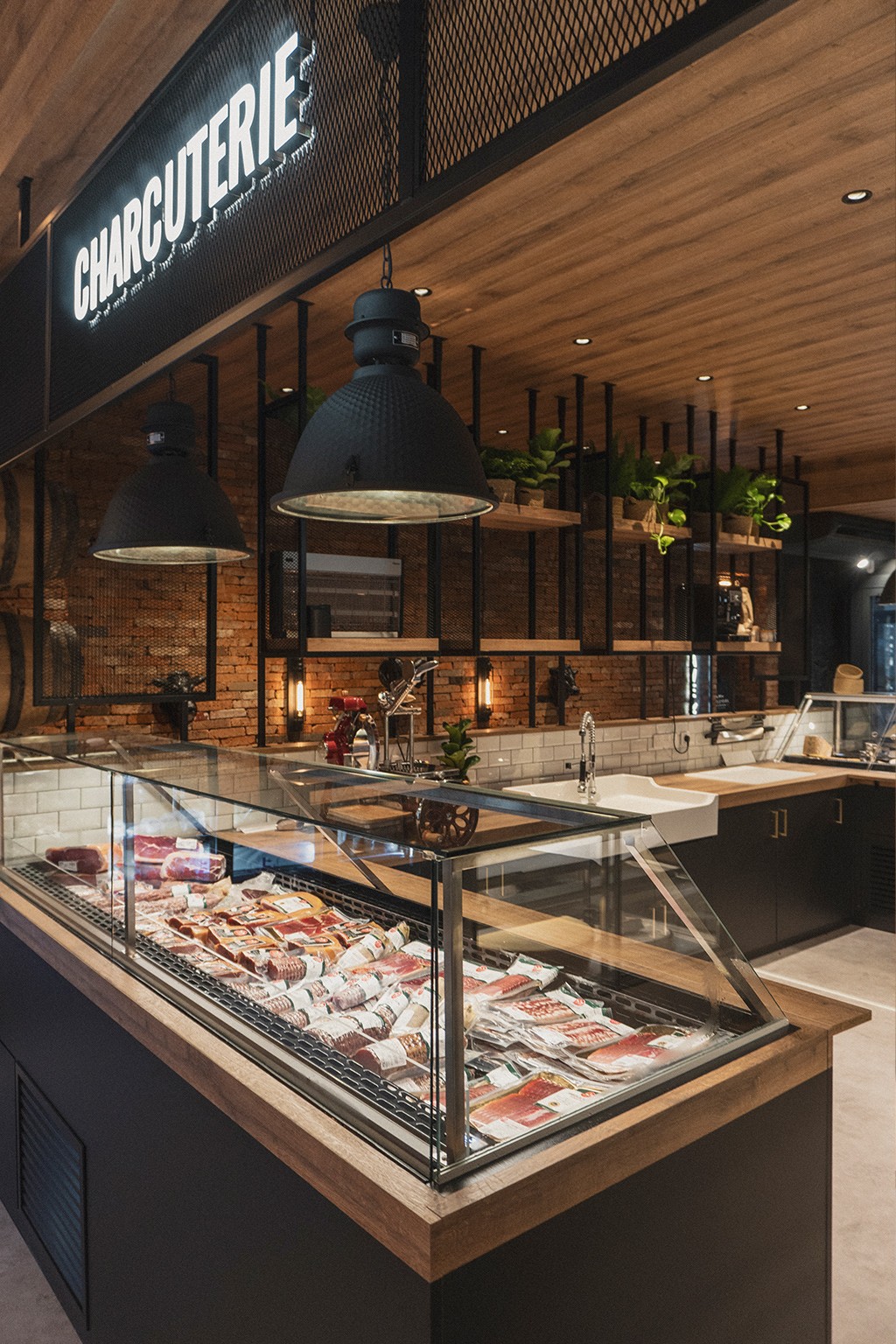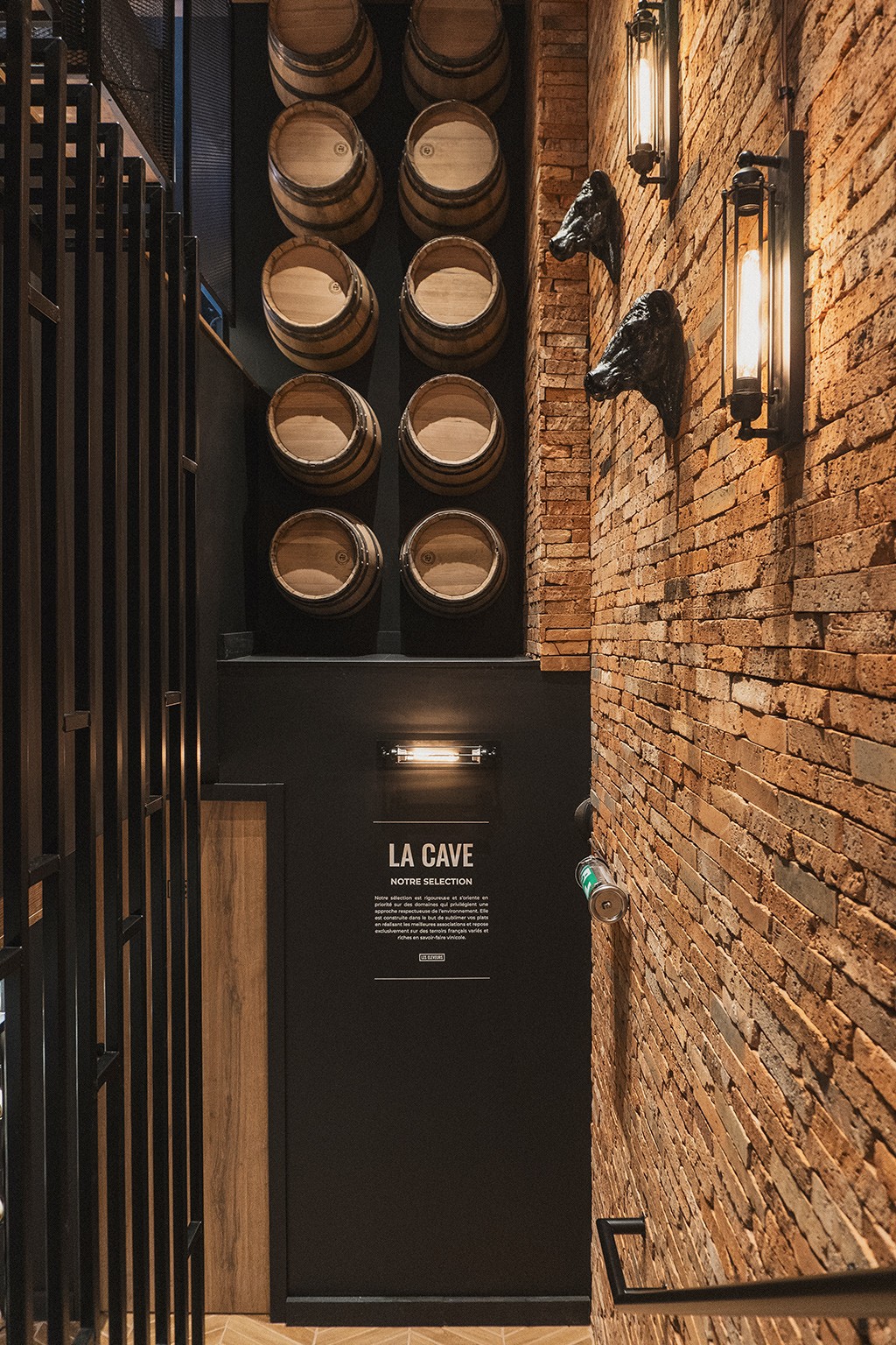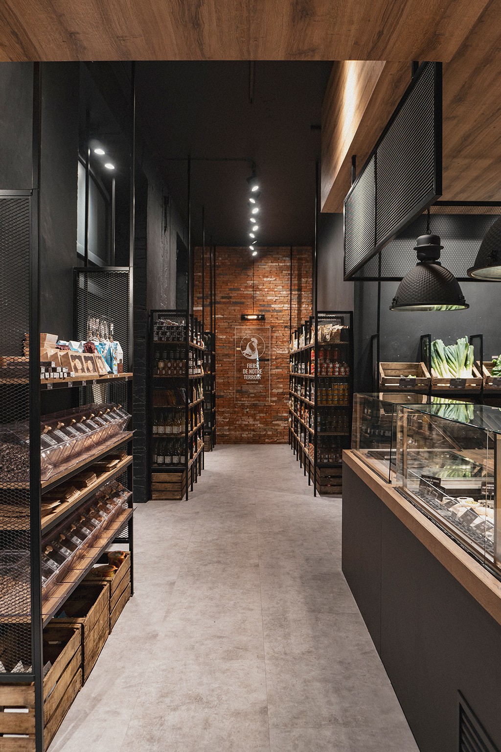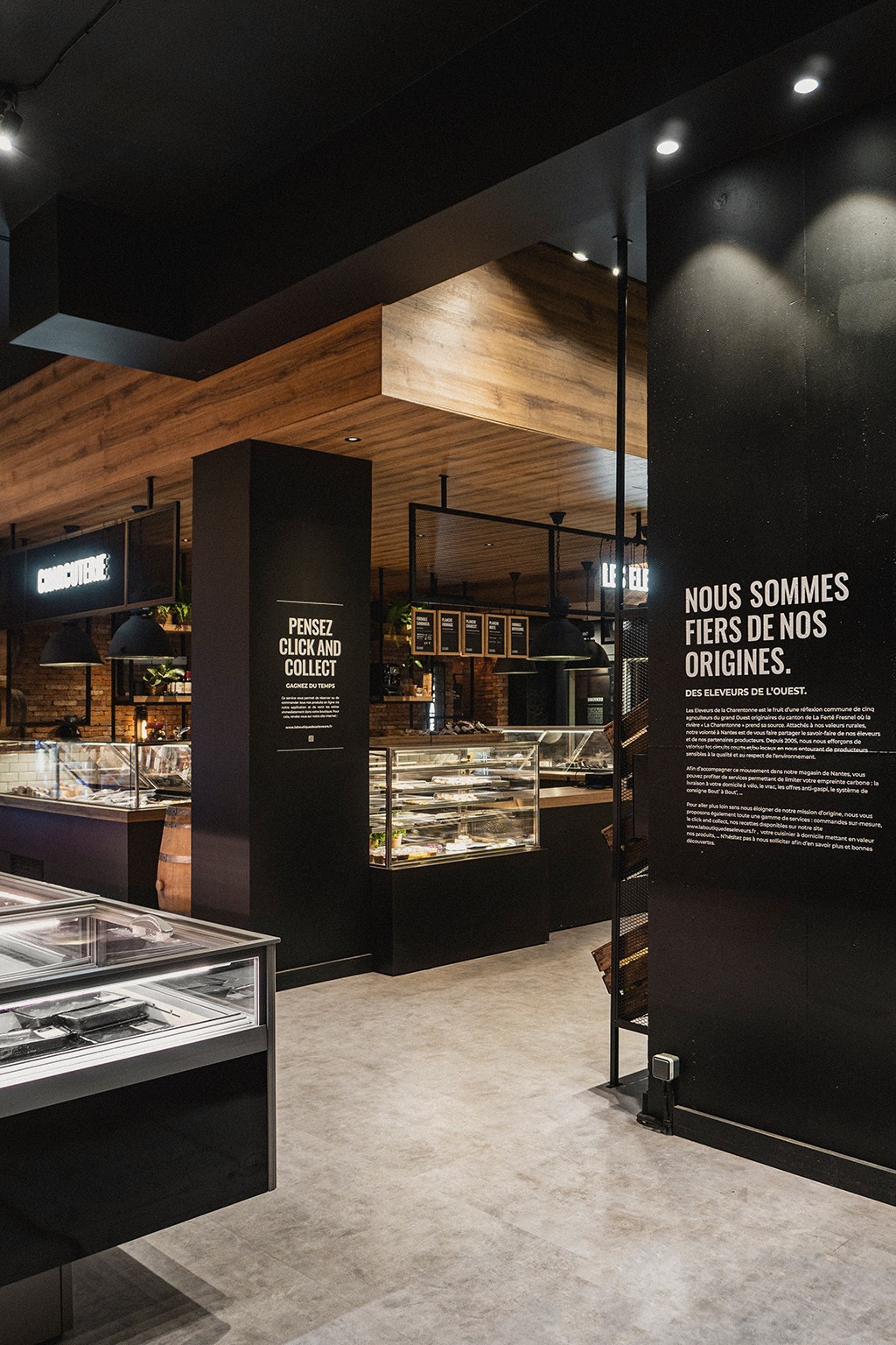 Le rez-de-chaussée s’articule autour d’un pôle central dédié à la coupe (fromagerie et charcuterie), véritable cœur battant du magasin, complété par une zone boucherie en libre-service, un espace primeur et une épicerie fine. En sous-sol, nous avons imaginé une cave de caractère, pensée comme un écrin confidentiel autour d'un espace de dégustation, invitant à la découverte et à l'échange. Un agencement sur mesure qui allie efficacité commerciale et esthétique premium.