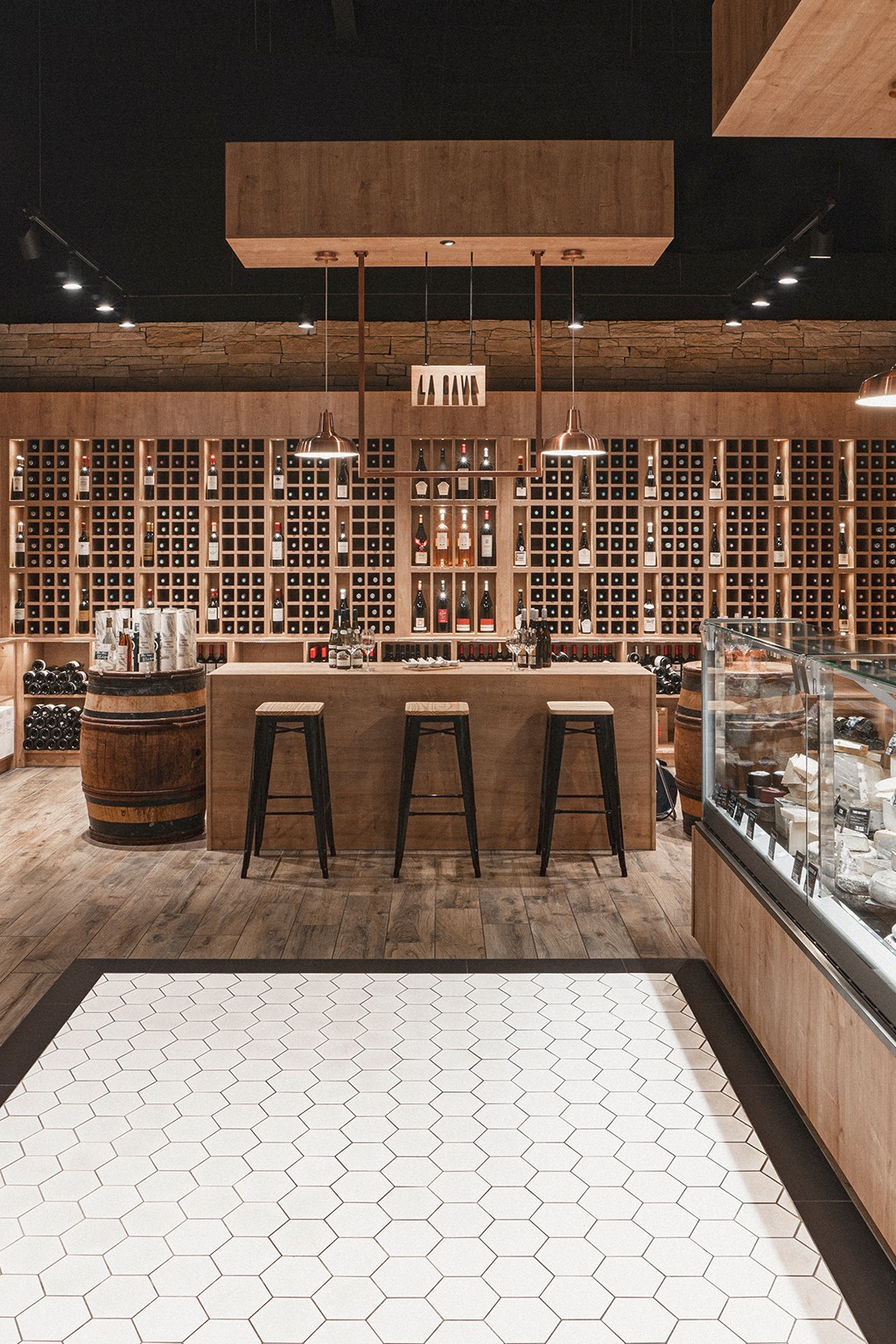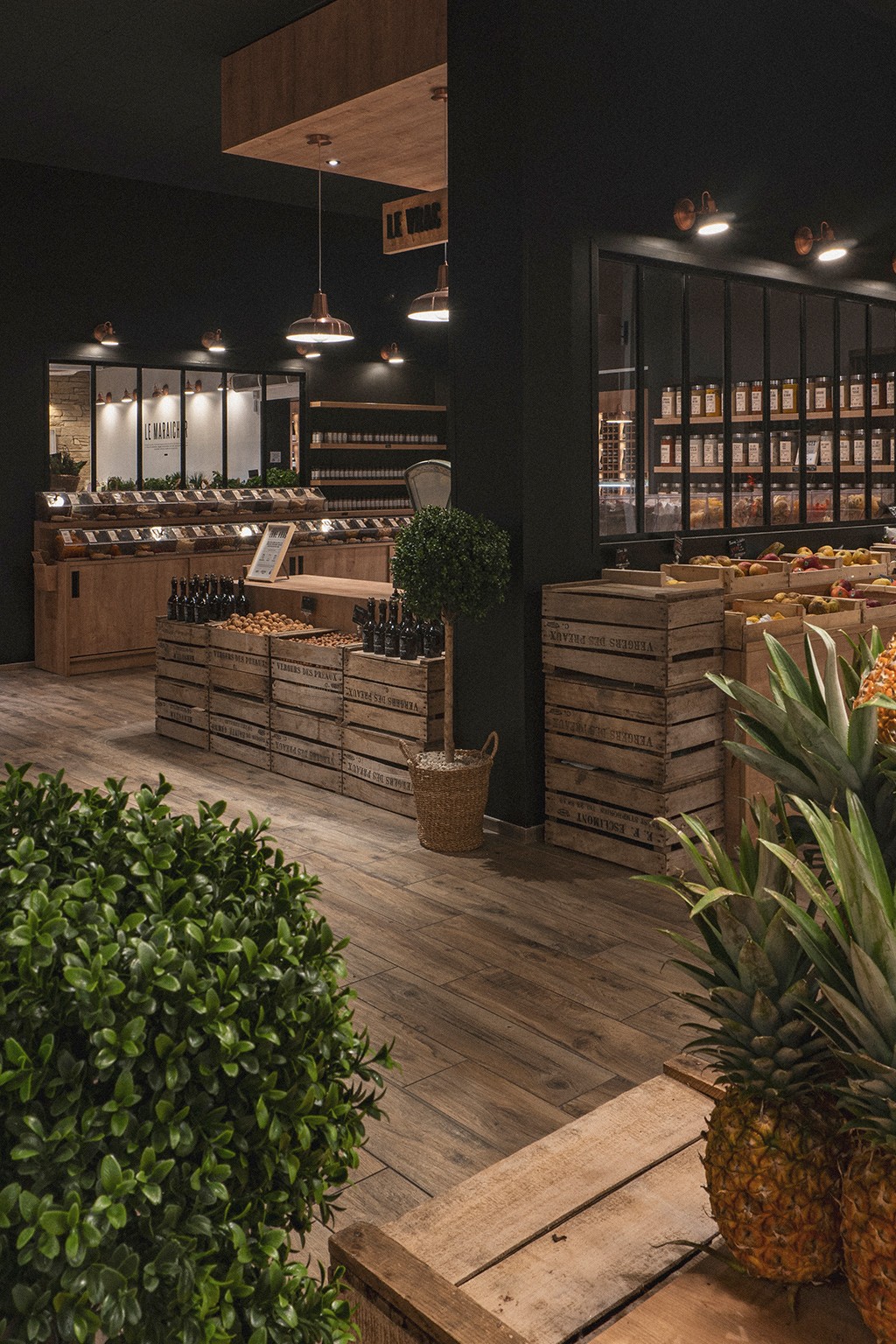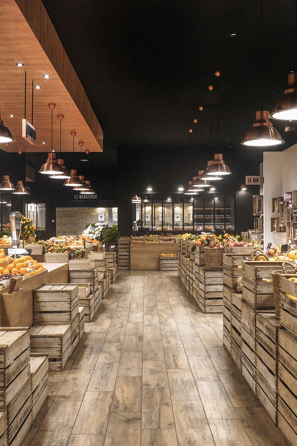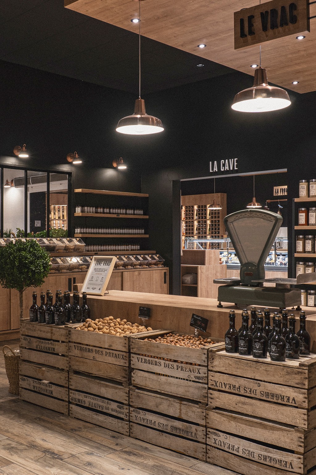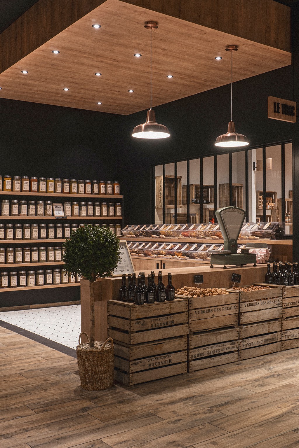 Sous des suspensions en métal cuivré diffusant une lumière douce, le parcours client est guidé par des présentoirs en bois brut et une mise en avant stratégique du logo, renforçant l'authenticité de l'enseigne. Cet agencement intuitif favorise une circulation fluide et invite les visiteurs à une véritable exploration gourmande, à la découverte de chaque espace.