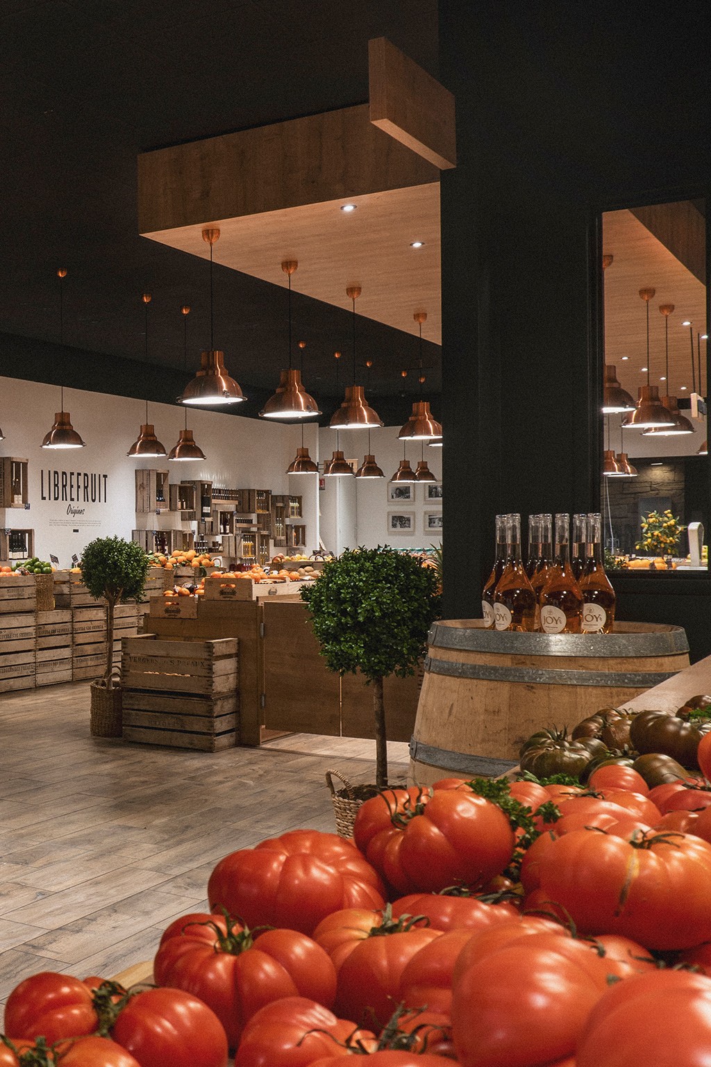 Librefruit a fait appel à notre studio pour repenser intégralement l'identité de son magasin : une cellule de 300 m² structurée en plusieurs zones dédiées à des univers spécifiques (fromagerie, cave, primeur, vrac et espace dégustation). Le concept affirme une esthétique industrielle chaleureuse, où l'aspect brut des matériaux souligne avec élégance la fraîcheur des produits.