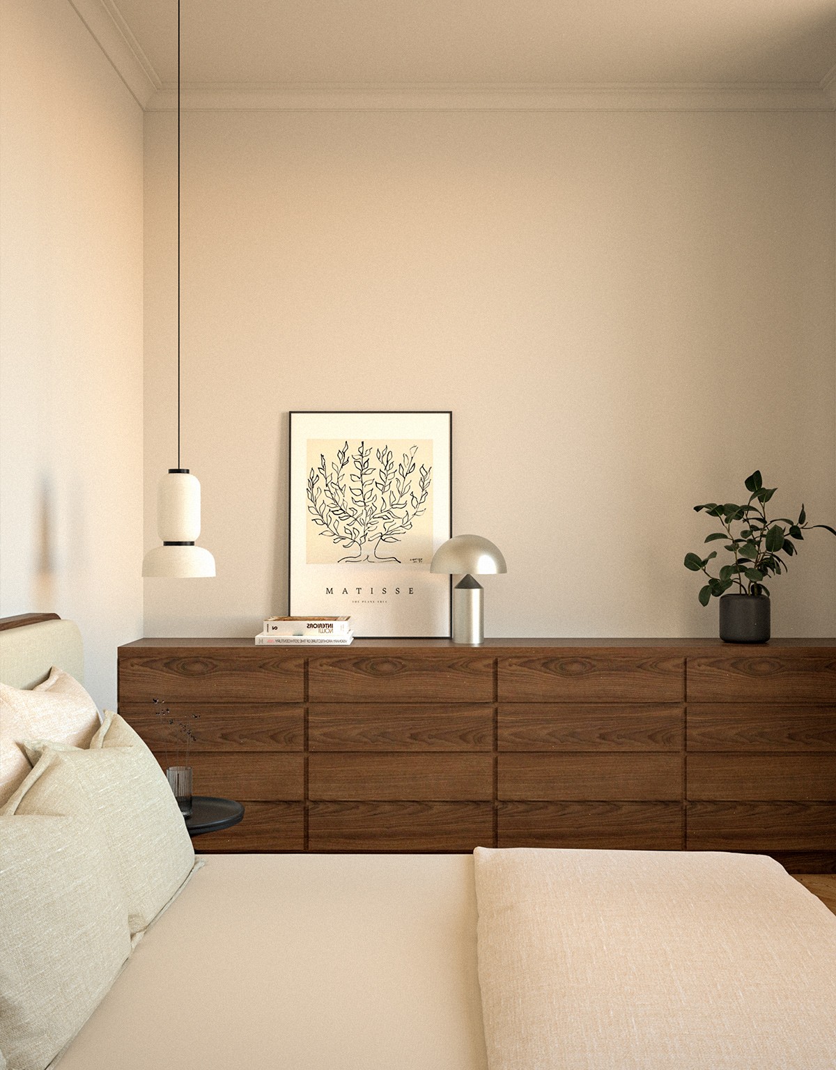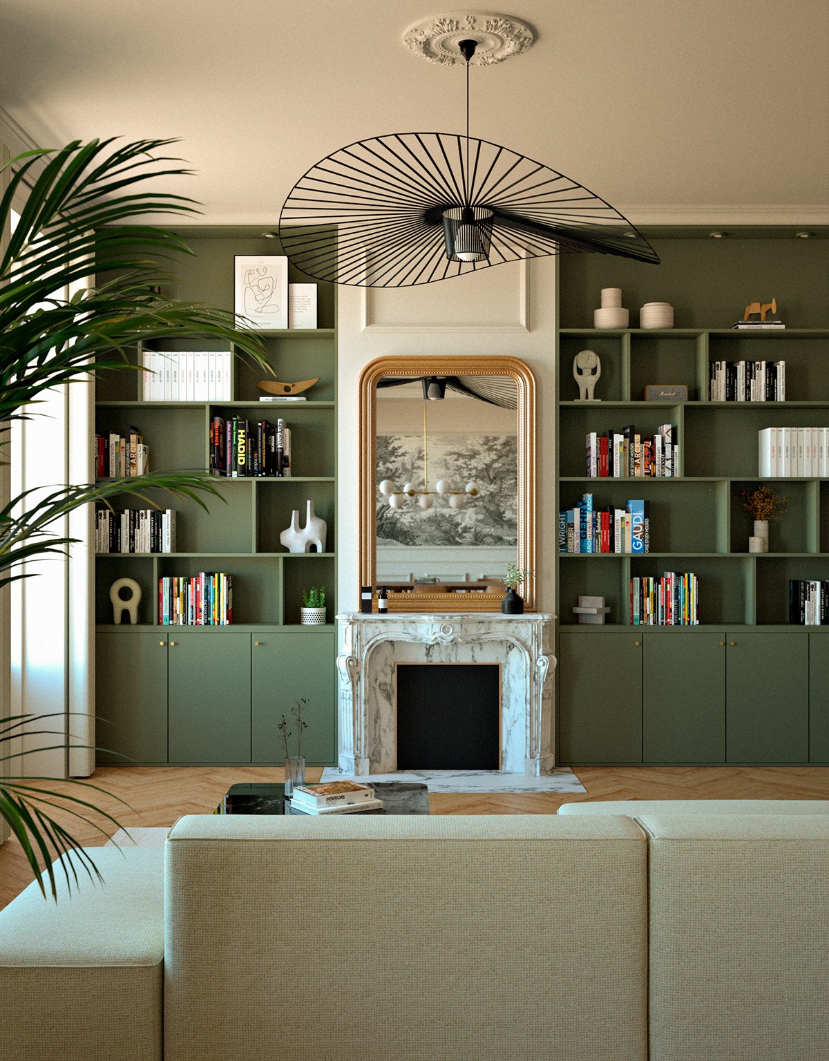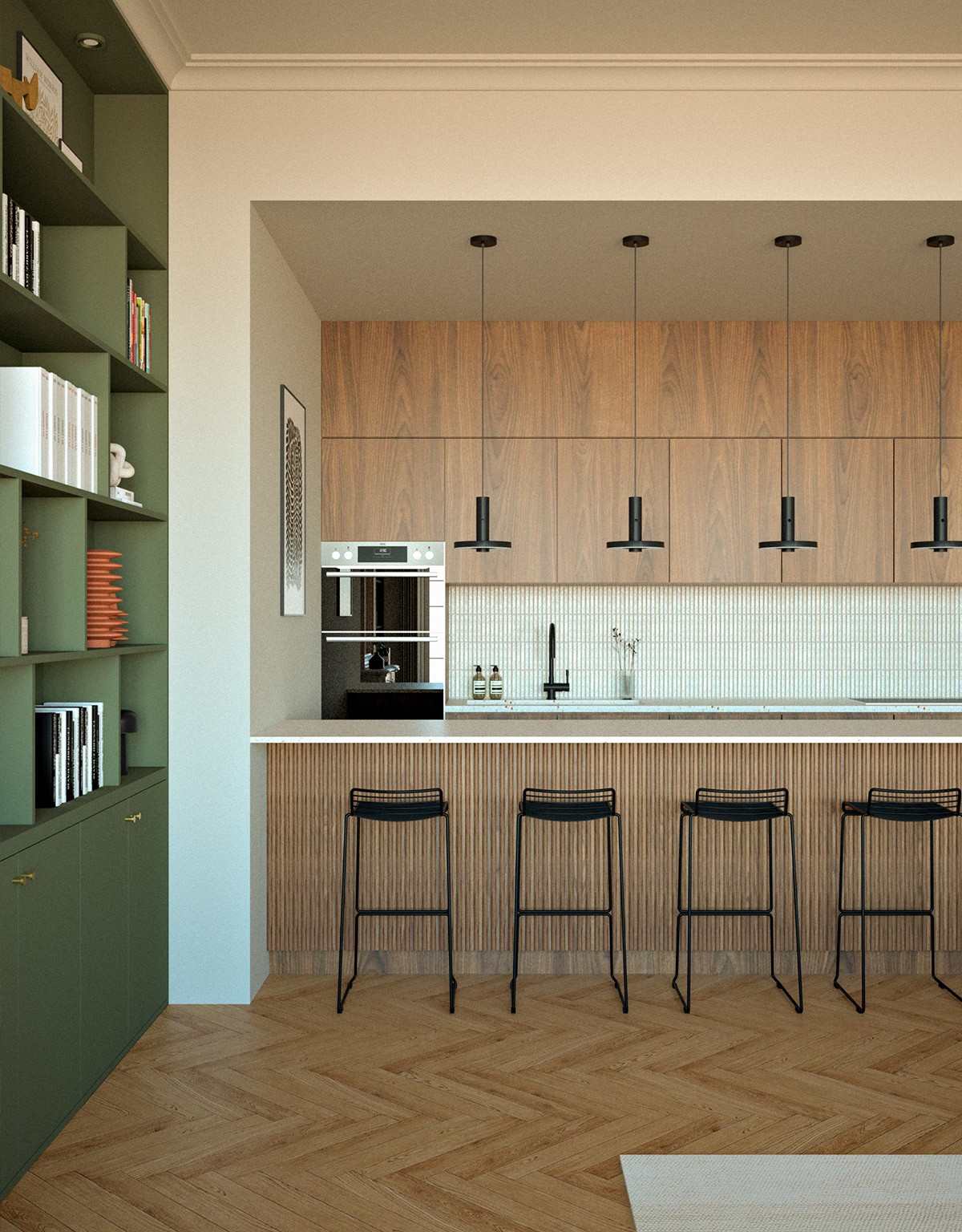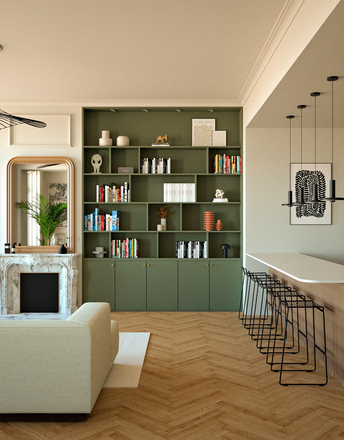 L’esthétique développée marie classique et modernité. Les menuiseries sur mesure structurent l’espace et créent une continuité visuelle apaisante. Les matériaux nobles, parquet en chevrons, marbre et noyer, dialoguent avec un vert profond et un ocre doux. Les textures travaillées et les accents de métal noir ponctuent l’ensemble, aboutissant à un intérieur harmonieux, raffiné et intemporel.